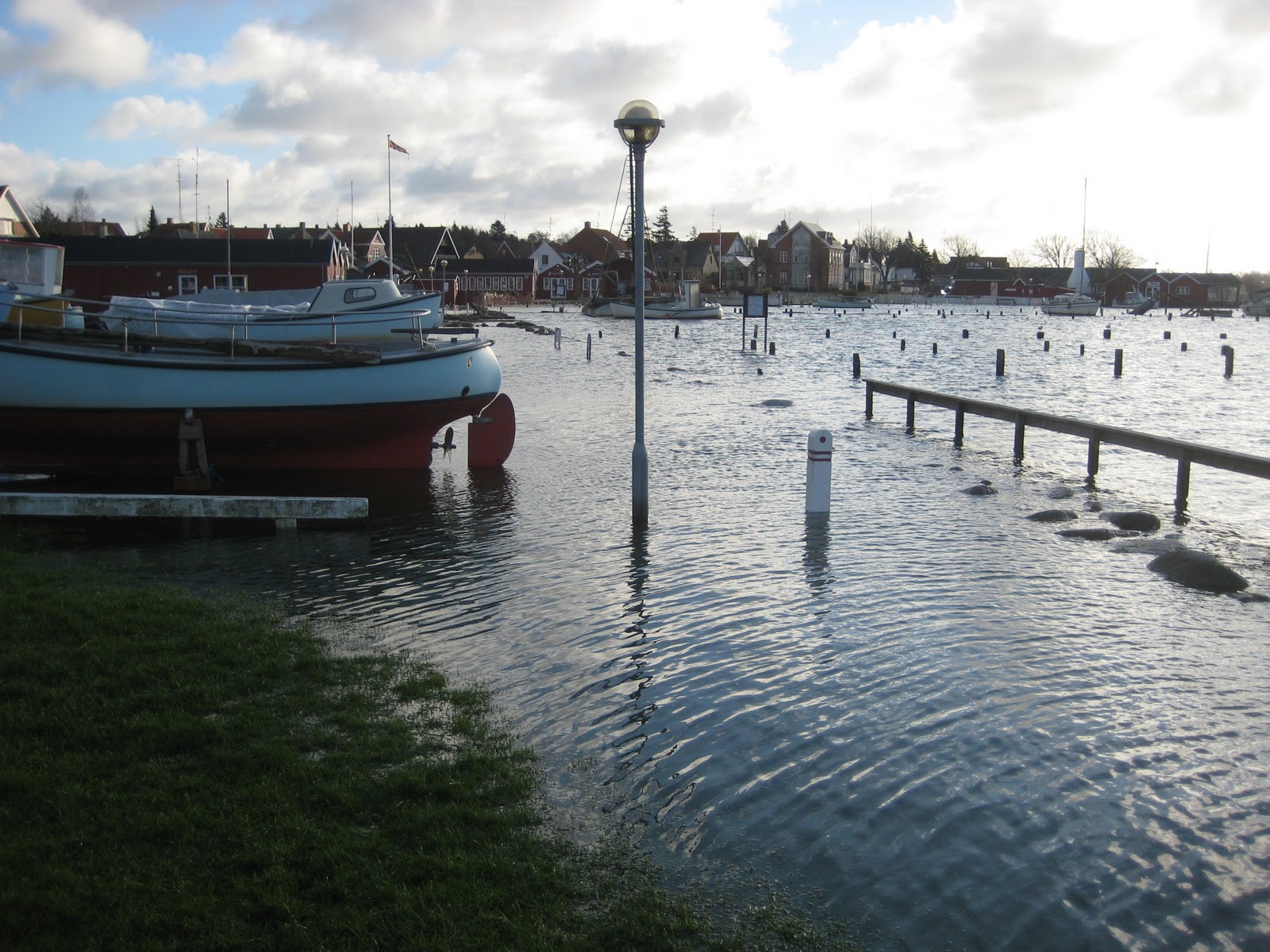 Two days ago, all the water was sucked out of the harbour, due to the gales here and in the UK. This morning the water came back! We are now floded!